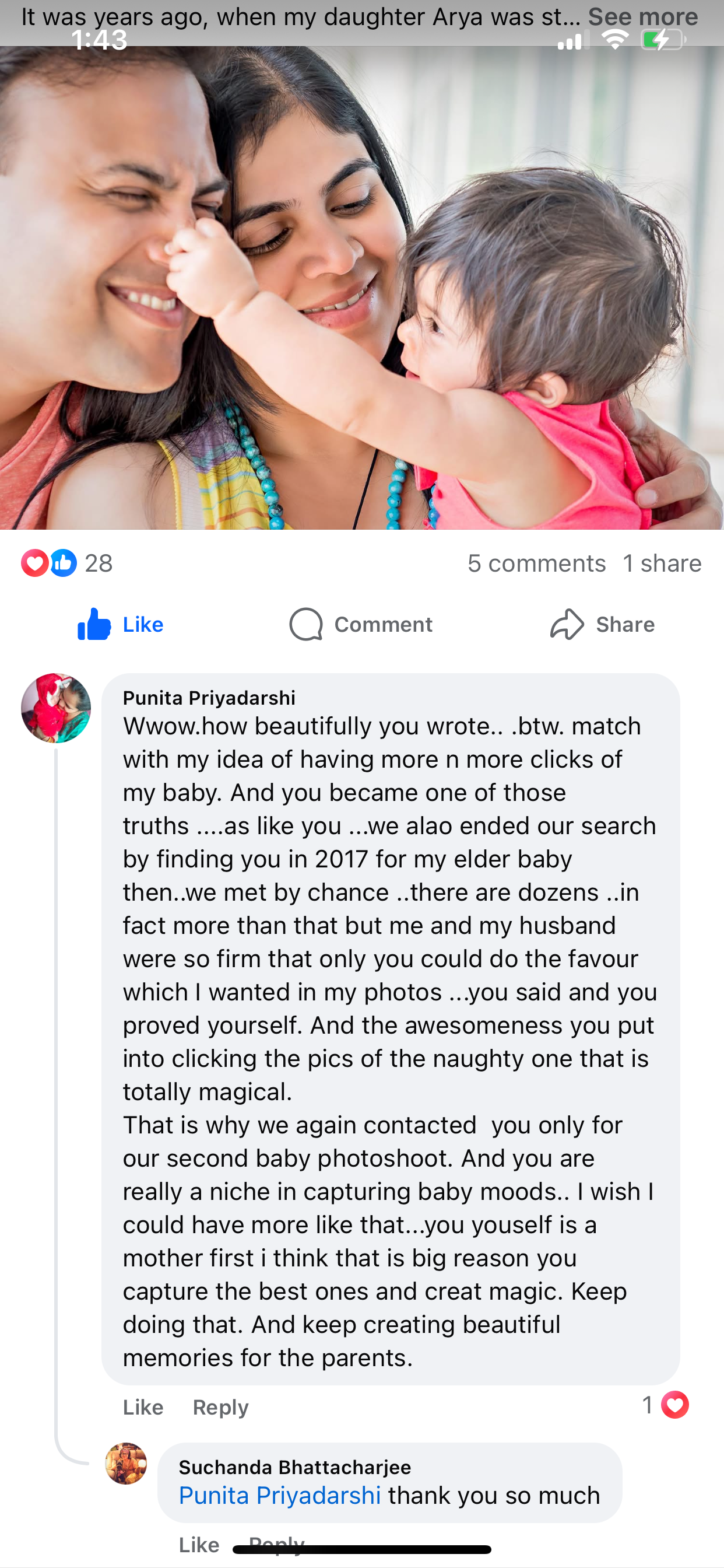 ⭐️⭐️⭐️⭐️⭐️ A Truly Magical Experience! We recently had a baby photography session, and I can confidently say it was nothing short of extraordinary. From the moment we arrived, Suchanda made us feel comfortable and completely at ease — and most importantly, our little one felt it too! The setup was not only professional but also cozy and baby-friendly. If you're looking for someone to capture the pure magic of your baby's early days, look no further. Thank you for giving us such beautiful memories!